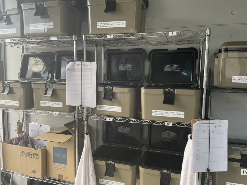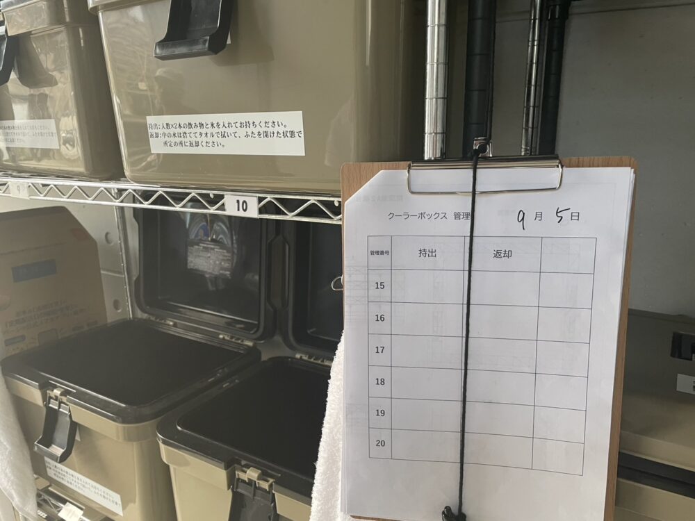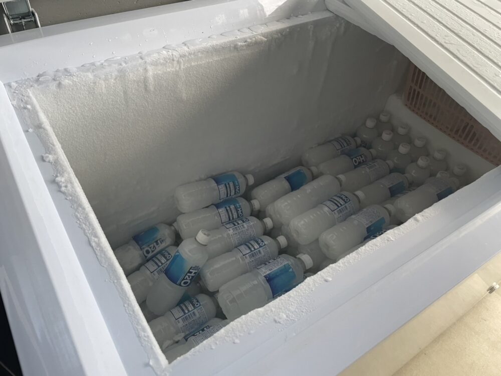 冷凍庫でしっかり凍らせたドリンクをクーラーボックスに入れて持ち出せるようにし、いつでも水分補給ができる体制を整えています✨